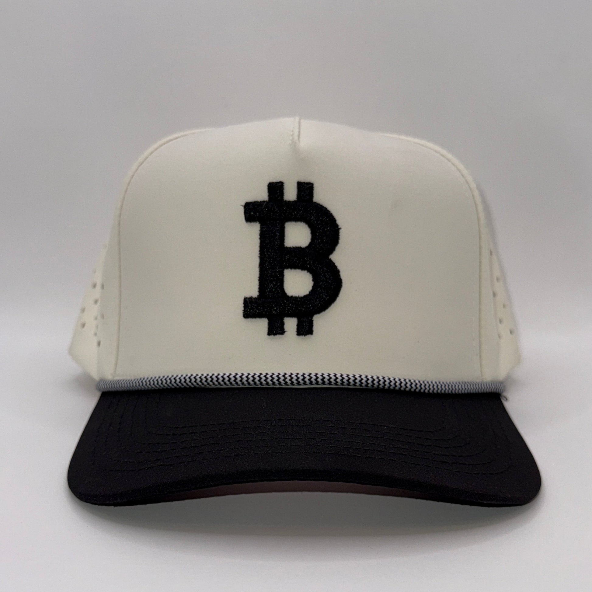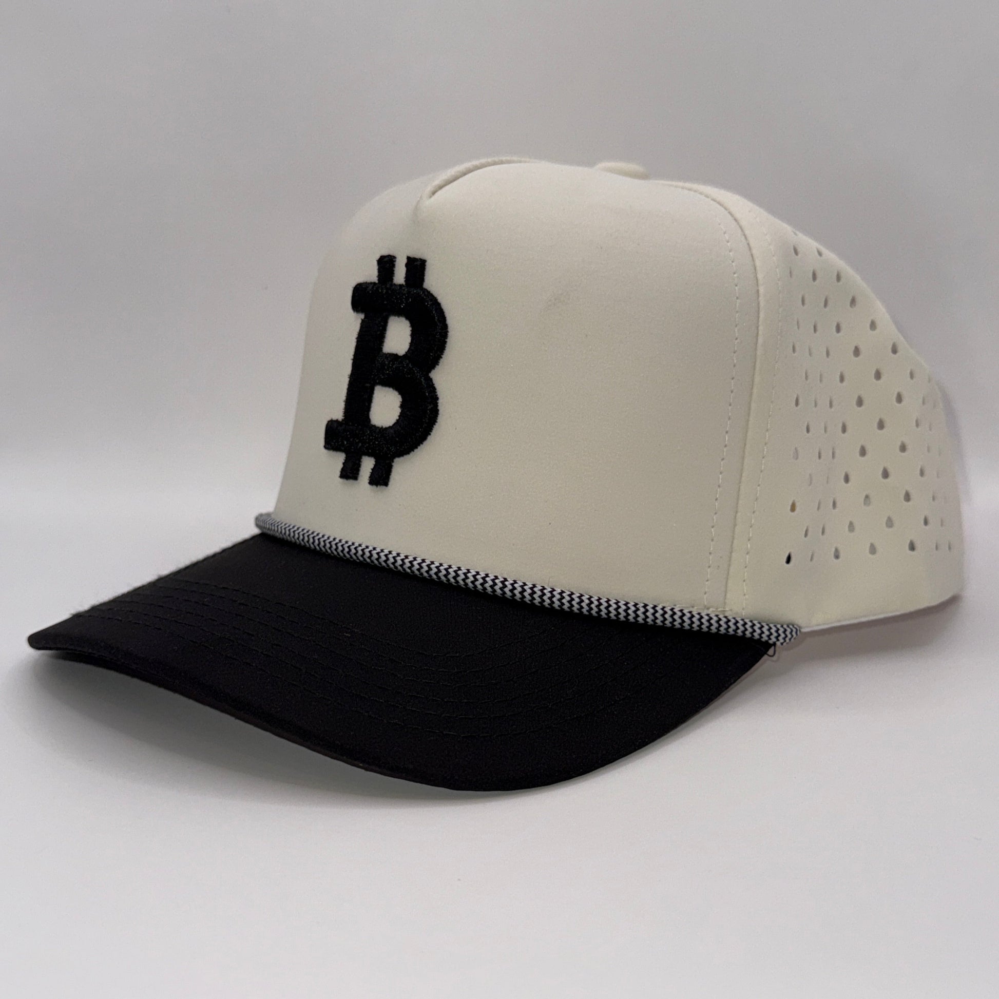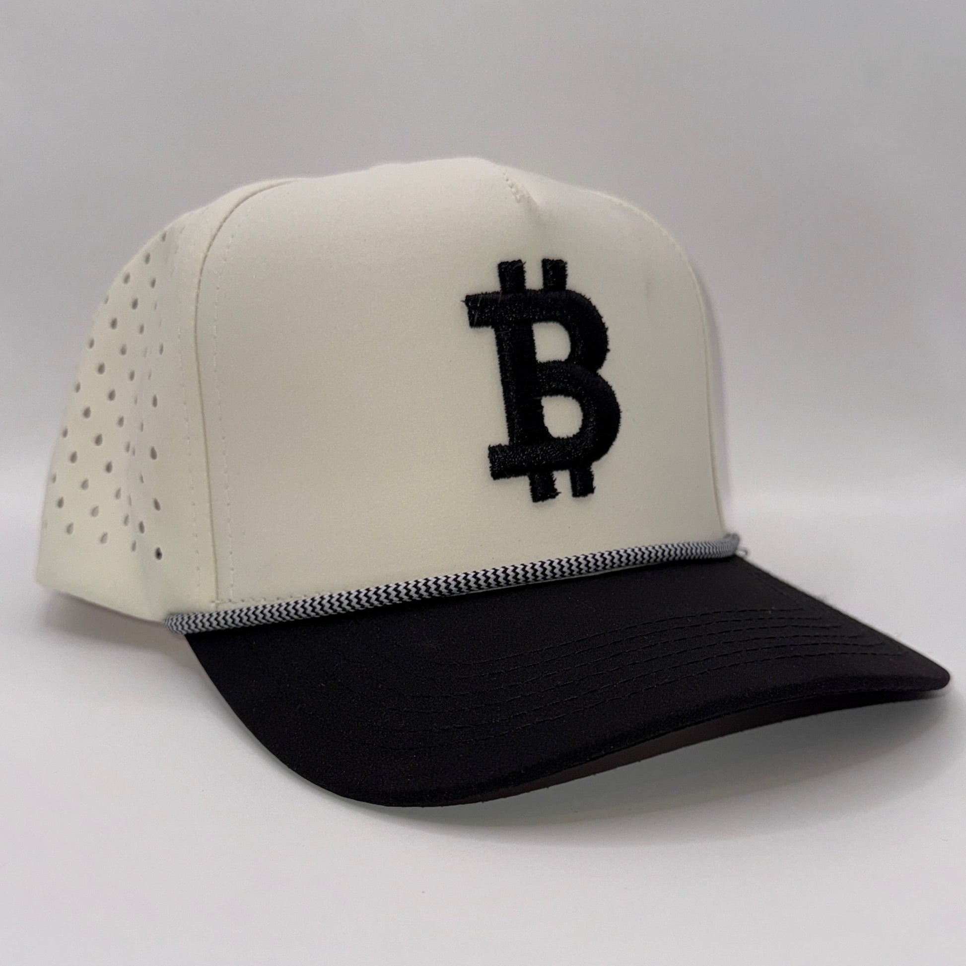 This Bitcoin 3D Tan & Black Rope Cap features a high crown design with a striking 3D Bitcoin logo on the front. The tan crown contrasts with the black bill, accented by a classic rope detail for a vintage-inspired look. Equipped with a snapback closure, it offers adjustable sizing to comfortably fit most heads. Ideal for enthusiasts seeking a stylish yet functional cap that showcases their interest in cryptocurrency with subtle sophistication.