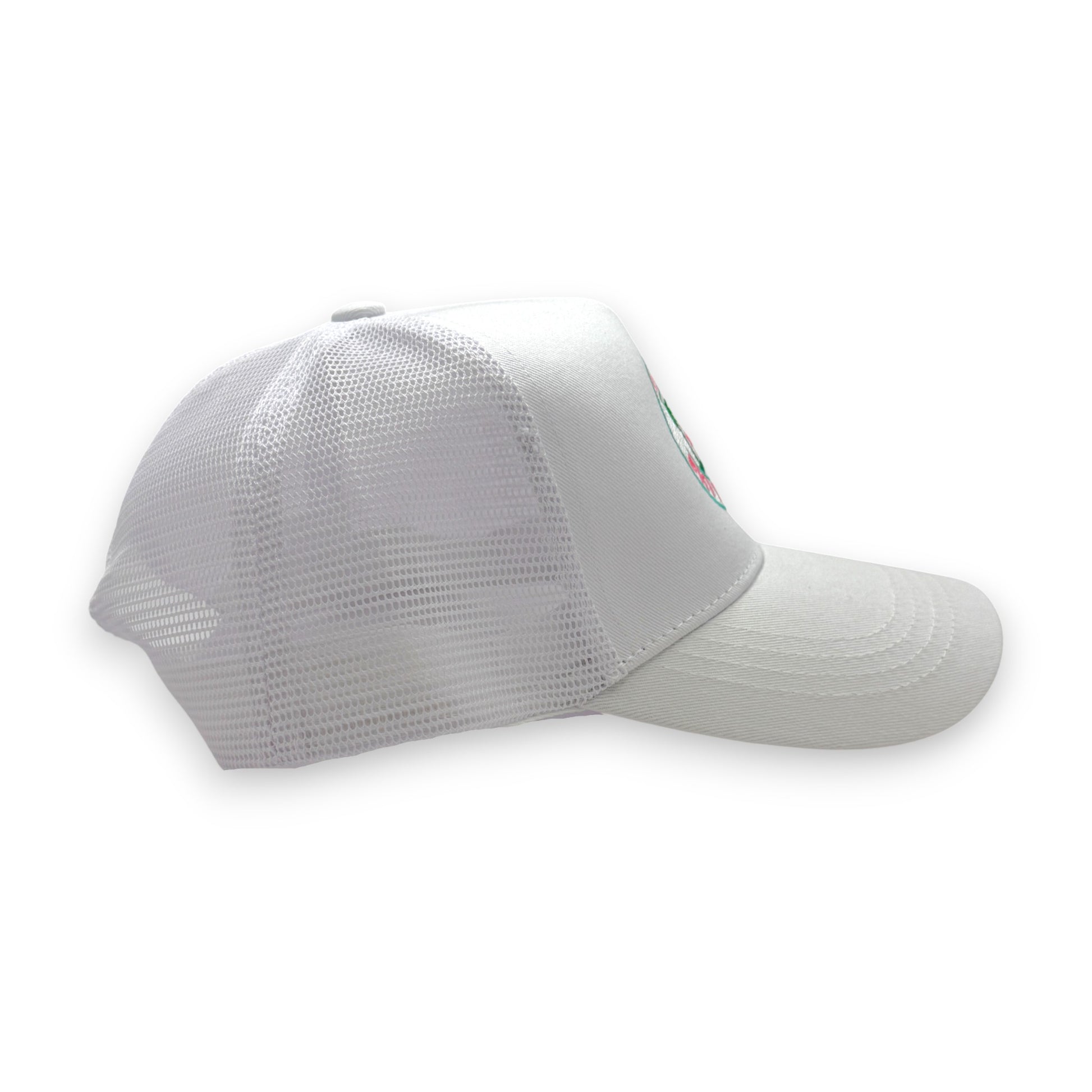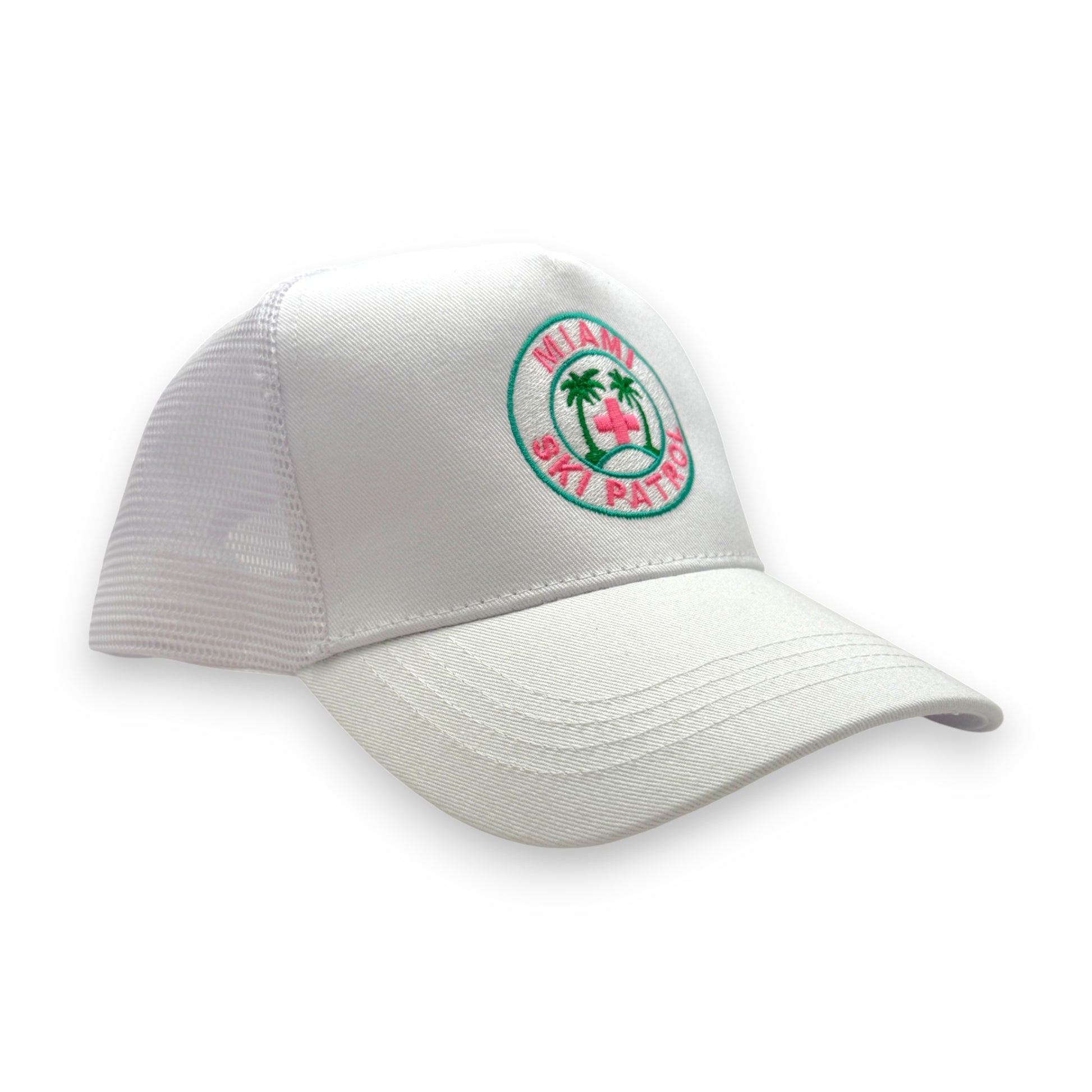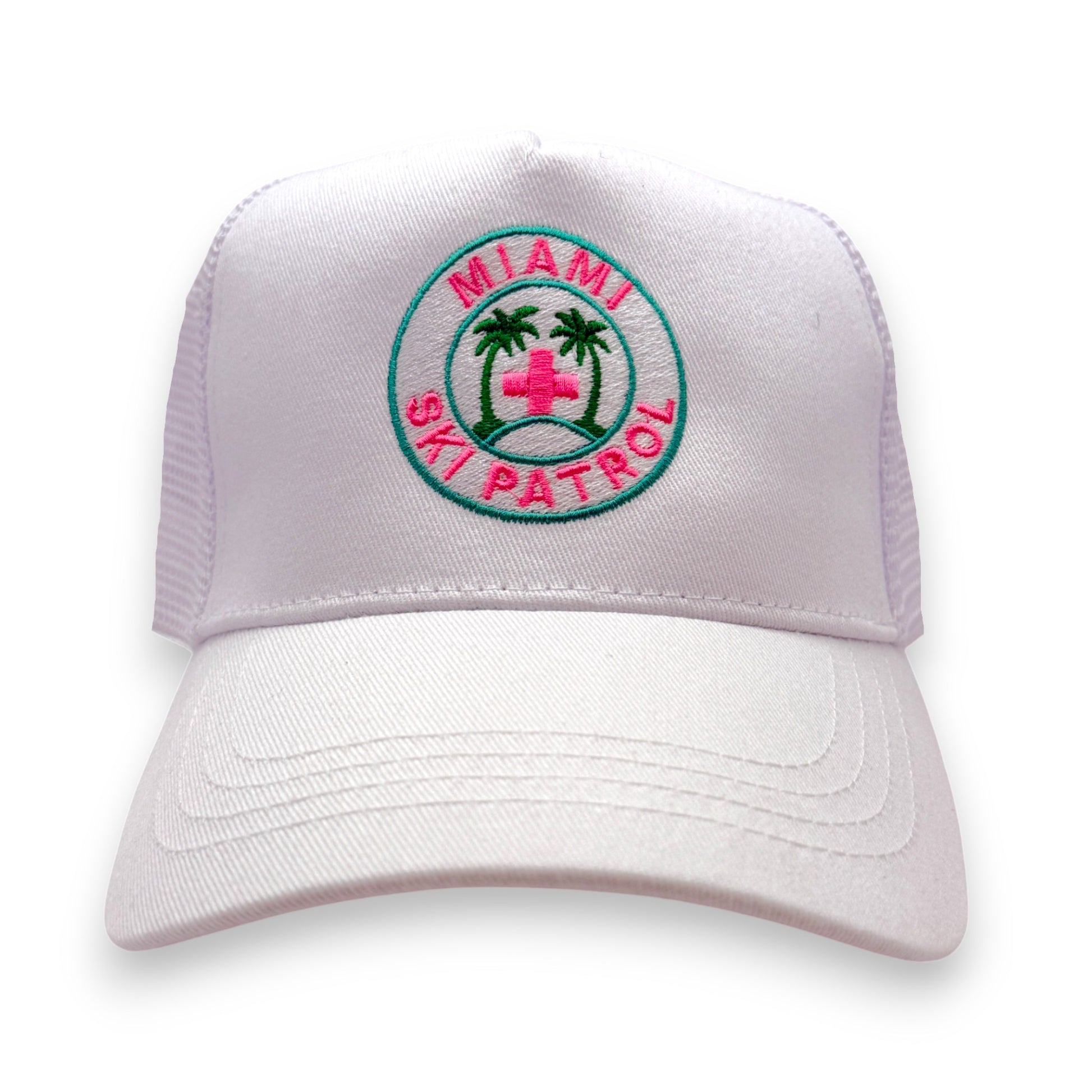 Embrace the irony – the Miami Ski Patrol cap is your go-to headwear for sunny slush vibes. Embroidered with palm trees and a ski cross, this cap is equal parts parody and style. Foam front, mesh back, adjustable snap closure. Available in All White, Teal/White and Pink/ White Variants.