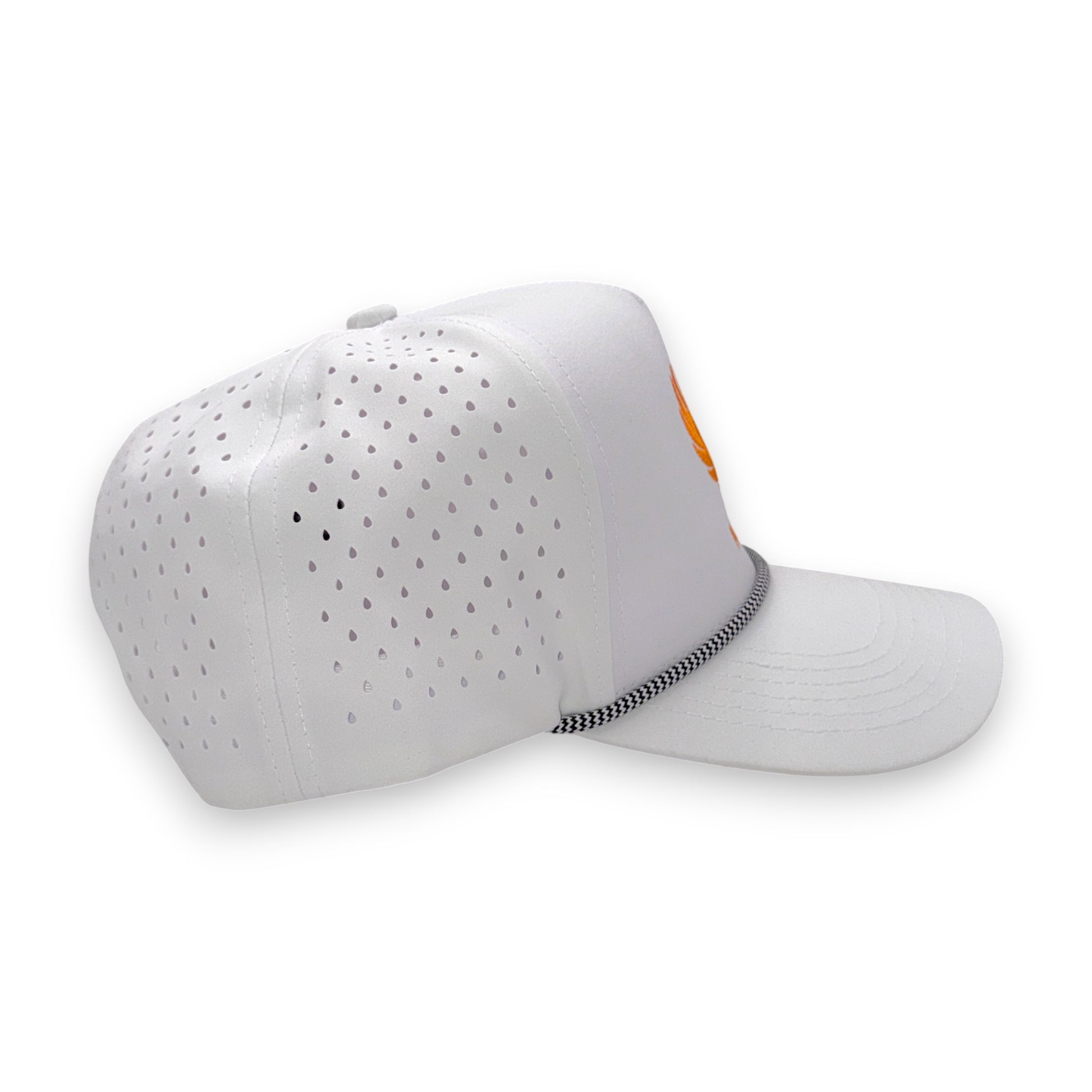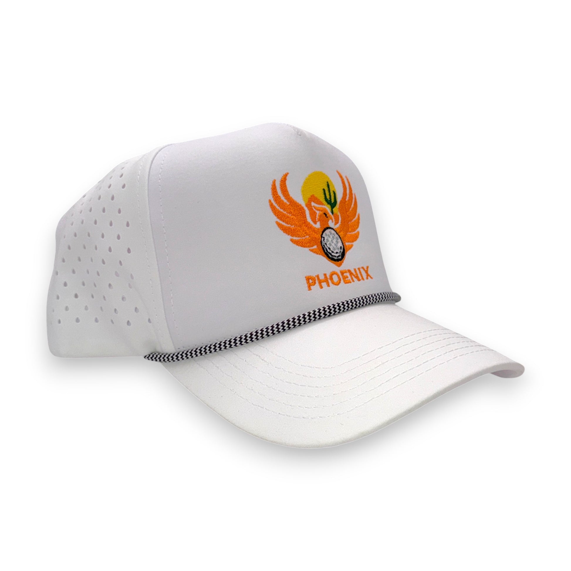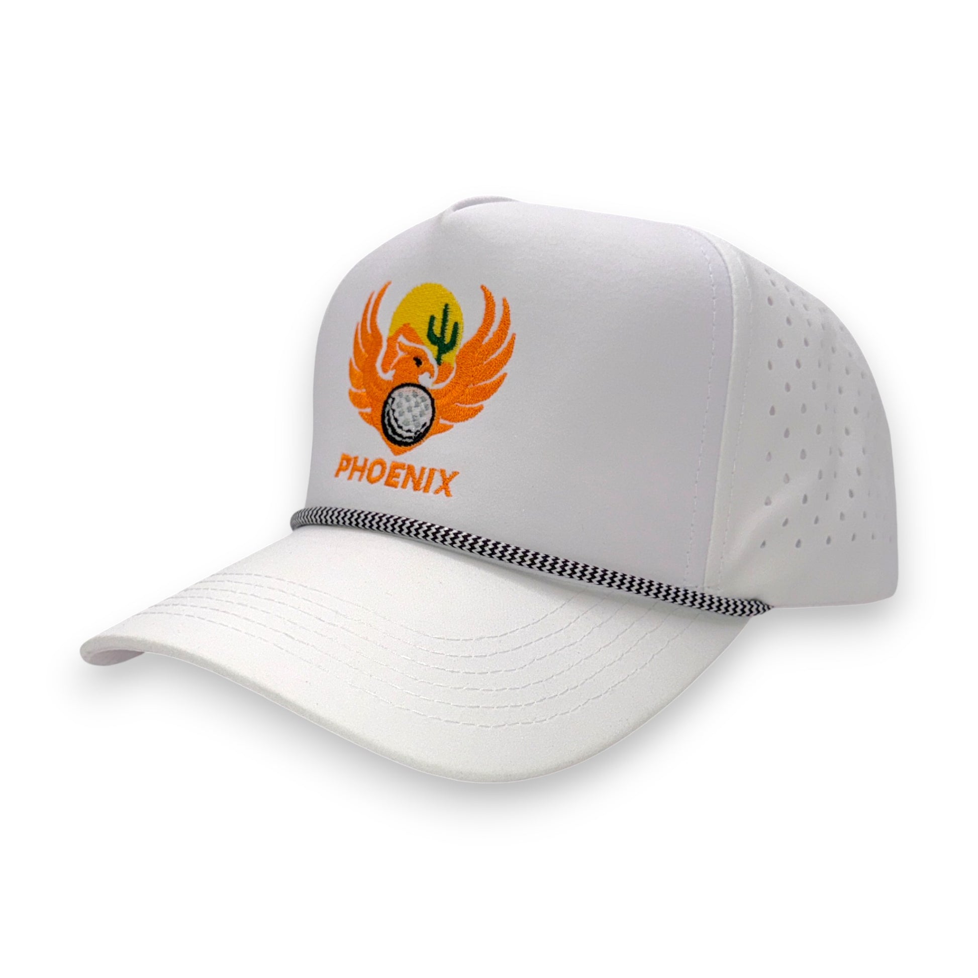 Ignite your game with the Phoenix Phoenix performance golf rope cap. Featuring a bold embroidered phoenix rising over a golf ball and desert cactus under the Arizona sun, this white snapback blends style with swagger. Breathable perforated sides and moisture-wicking performance fabric make it the perfect hat for the course, the clubhouse, or the streets.