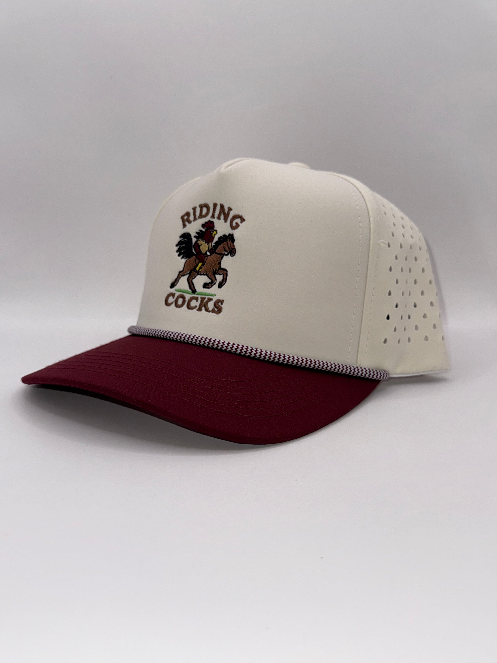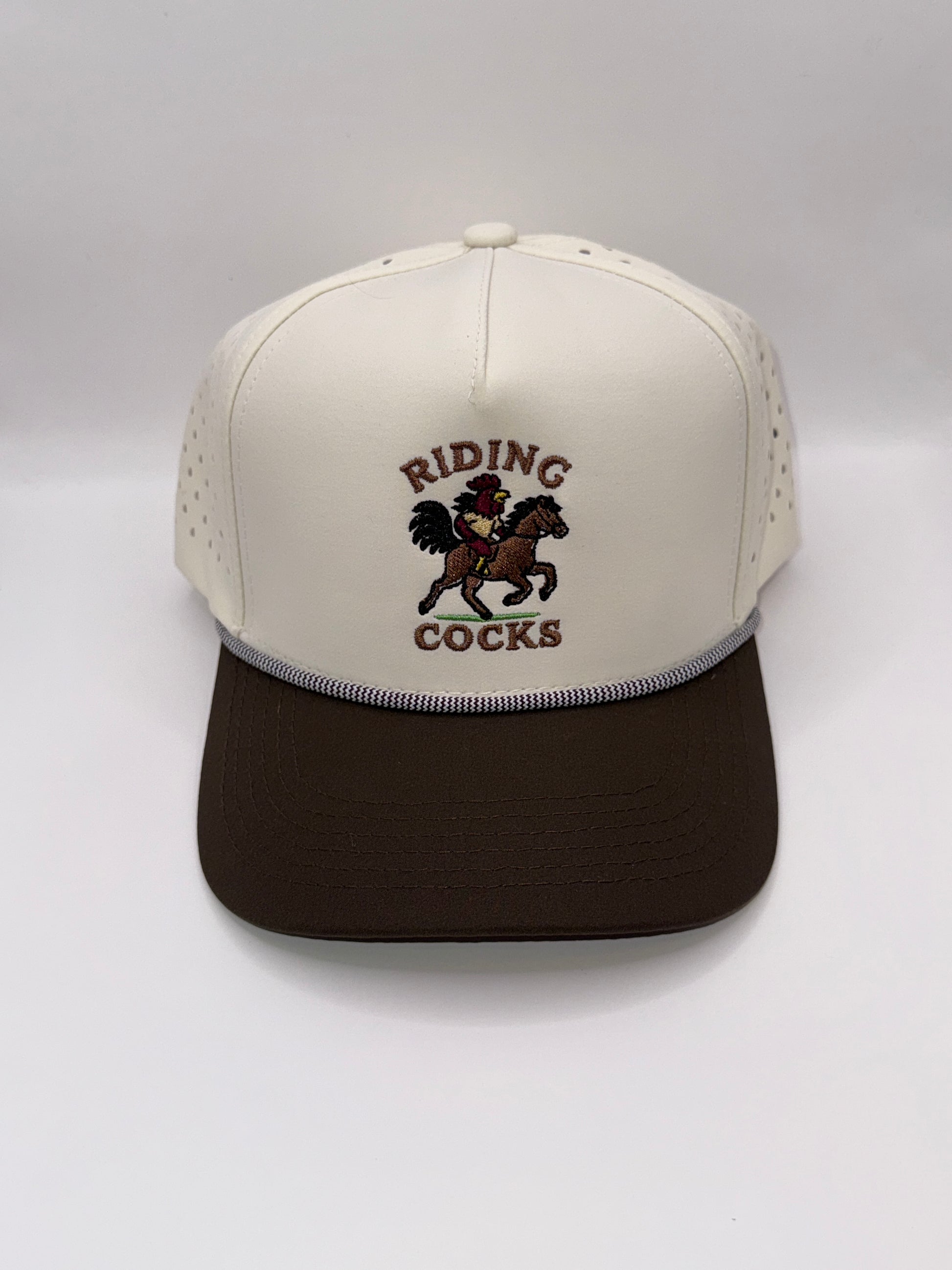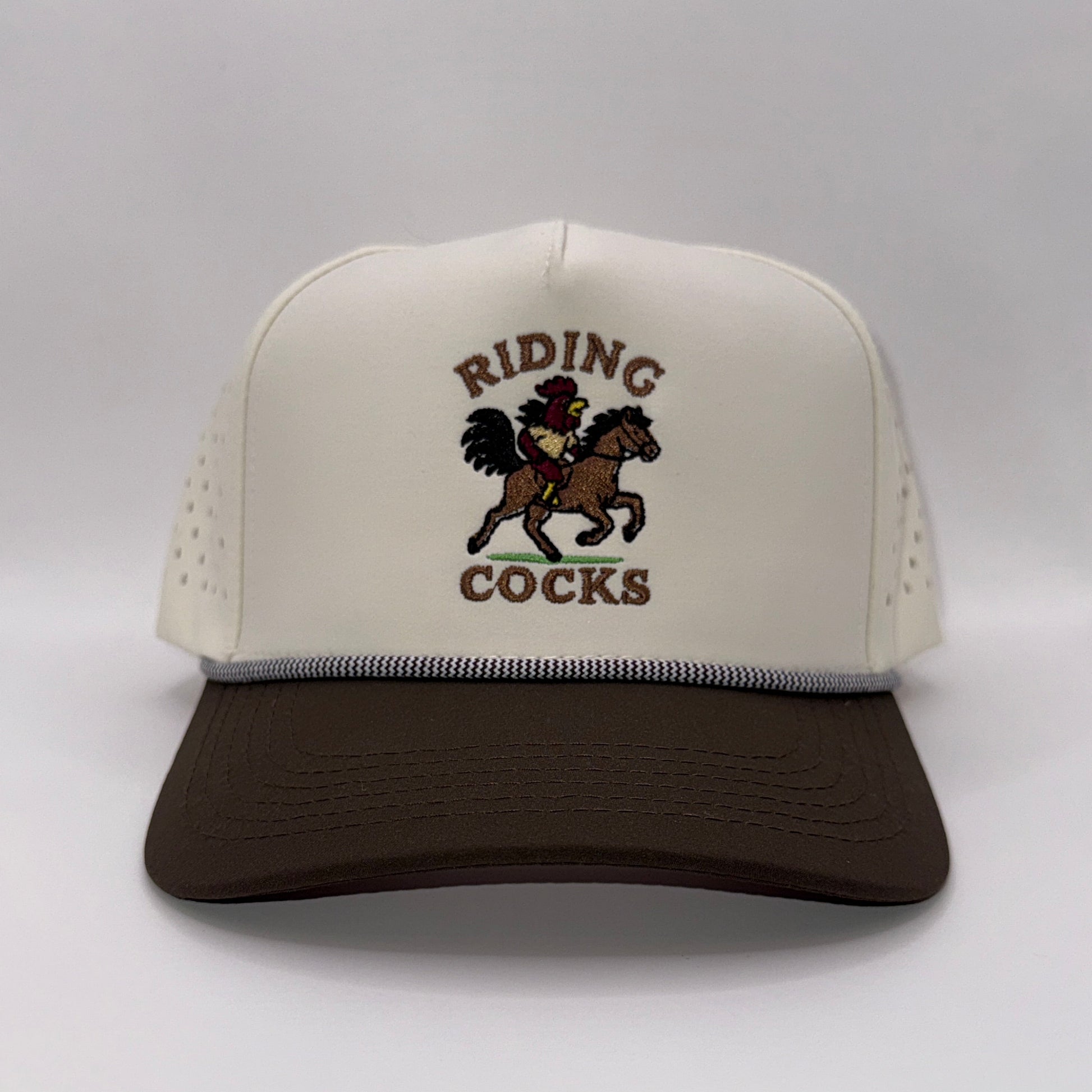 The Riding Cocks Rope Cap features a distinctive design of a rooster riding a horse, combining bold imagery with classic style. Crafted with a tan crown and accented by rope detailing, this adjustable snapback offers a comfortable fit for most head sizes. Ideal for those seeking a unique, statement-making accessory with expert craftsmanship and durable materials.