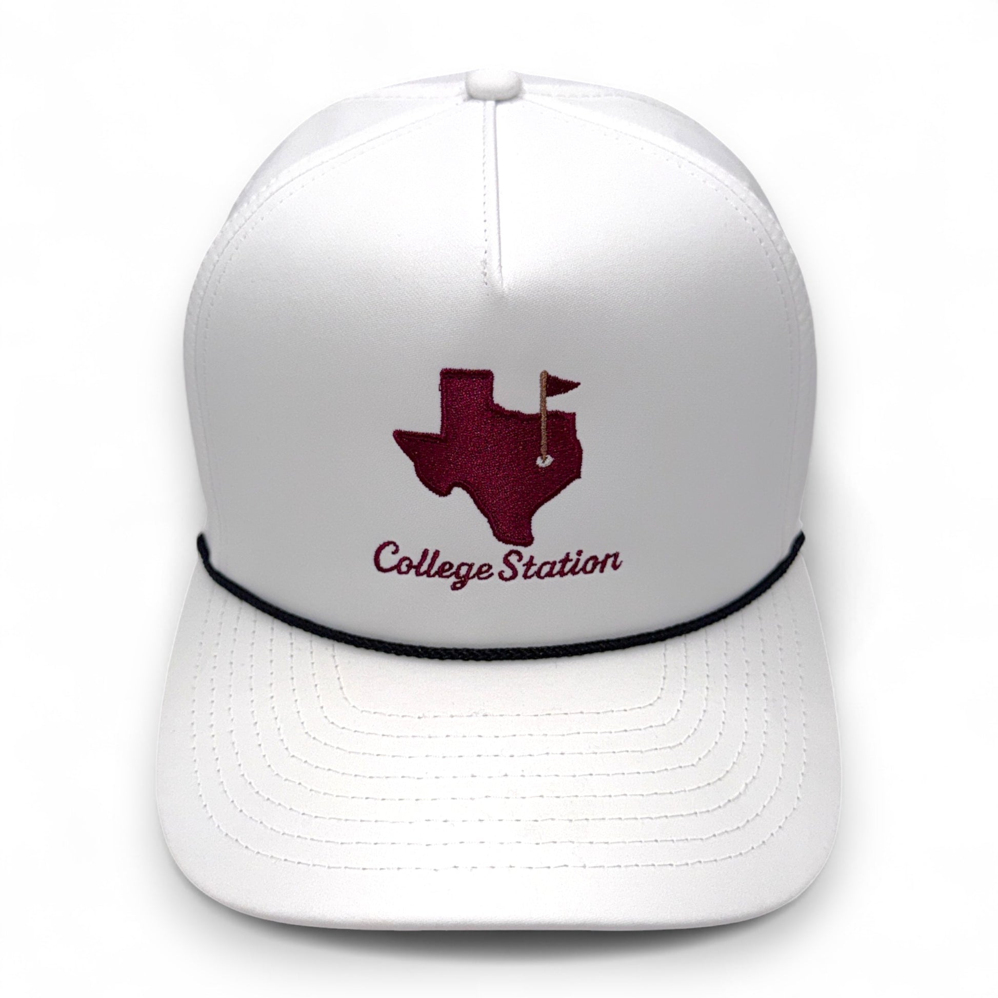 This hat features a deep maroon embroidered Texas silhouette with a flag marking College Station — a subtle nod to tradition and pride. Below it, the College Station script flows in a vintage cursive that feels straight out of a handwritten postcard home.